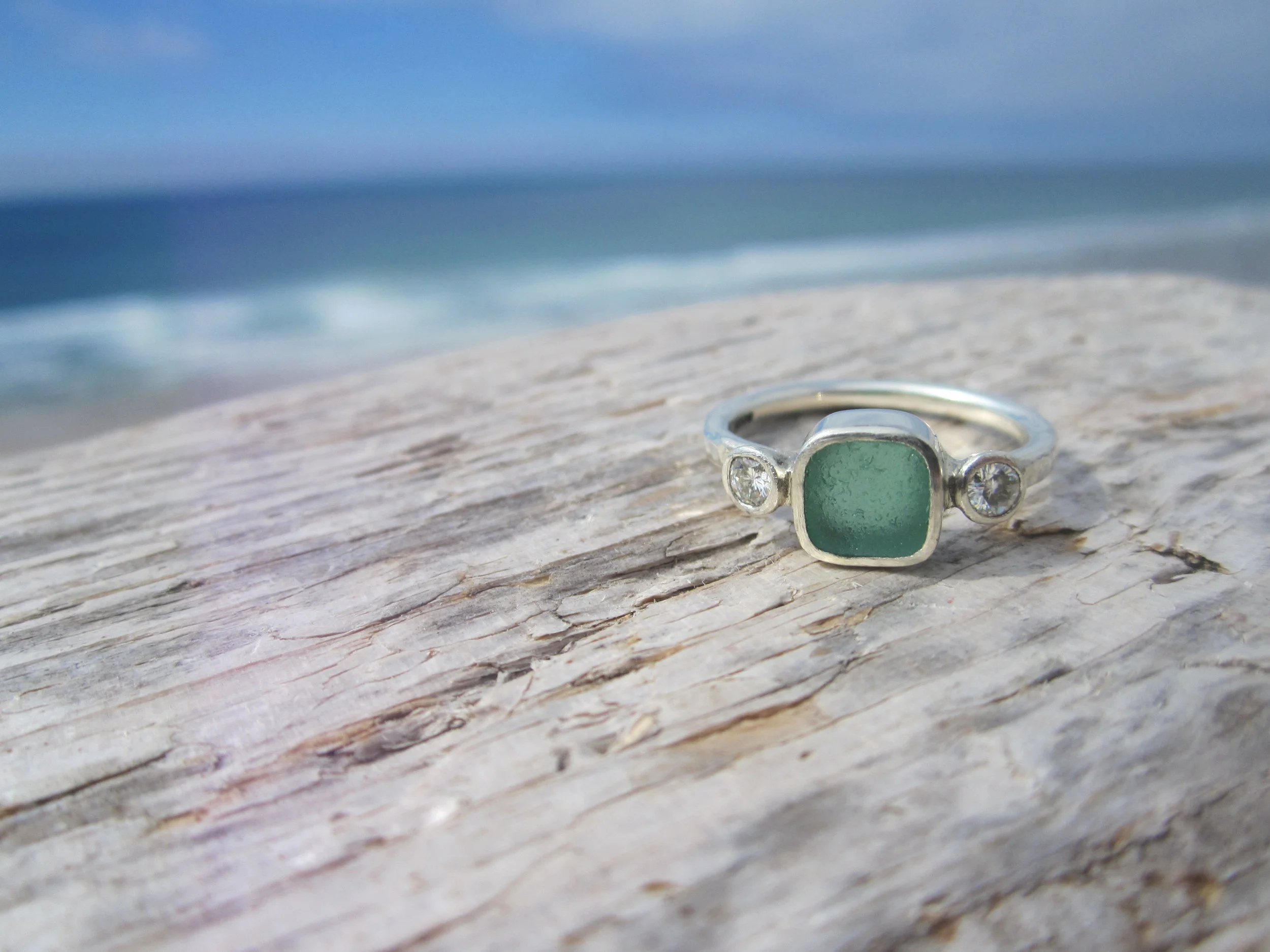 Sea glass engagement rings and wedding bands handmade in Cornwall using Cornish sea glass and recycled silver, yellow rose or white gold with moissanite or ethical lab created diamonds